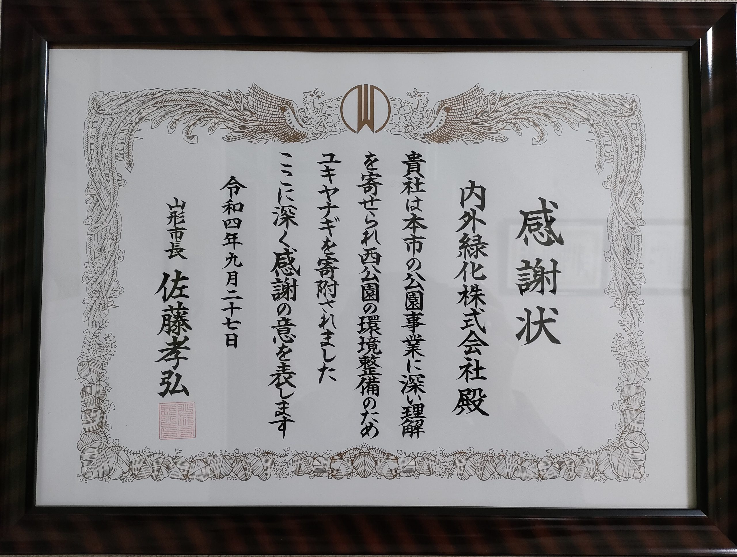 9月に行った当社の創業50年記念事業として西公園にユキヤナギを500本を植栽寄贈しました。この事で山形市から市長直々に感謝状をいただきました。